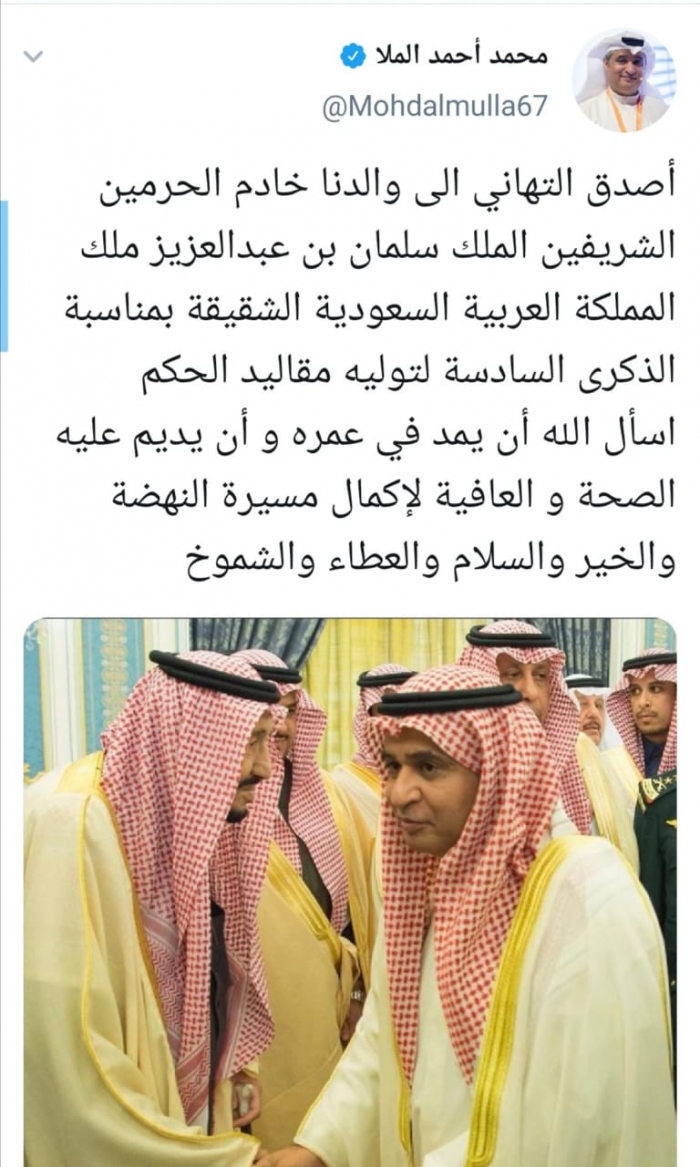 وكتب الملا في تغريدة له عبر حسابه بتويتر ورصدها "المشهد العربي": "أصدق التهاني إلى والدنا خادم الحرمين الشريفين الملك سلمان بن عبدالعزيز ملك المملكة العربية السعودية الشقيقة بمناسبة الذكرى السادسة لتوليه مقاليد الحكم".
