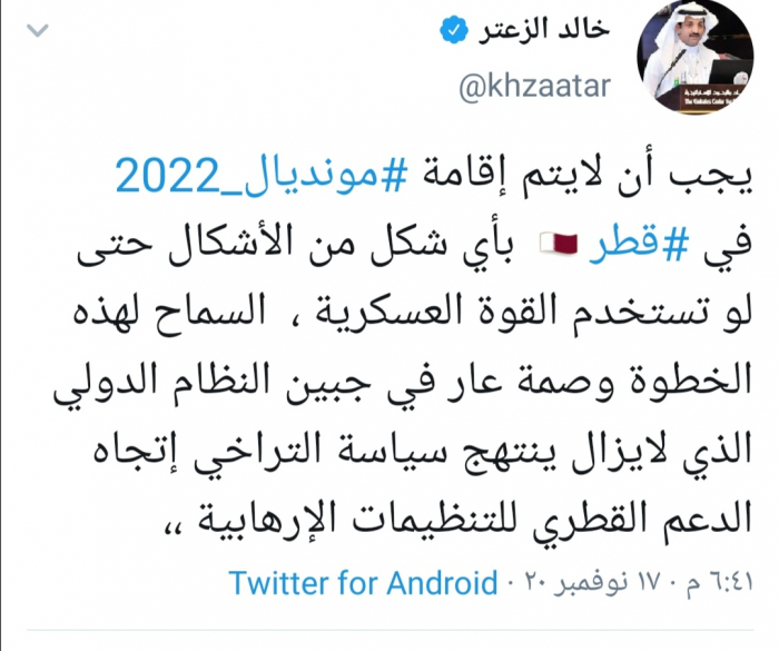 وقال الزعتر عبر تغريدة له على "تويتر" رصدها "المشهد العربي" :"يجب أن لايتم إقامة #مونديال_2022 في #قطر بأي شكل من الأشكال حتى لو تستخدم القوة العسكرية".