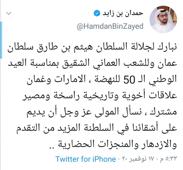 وقال الشيخ حمدان في تغريدة له عبر حسابه بتويتر ورصدها المشهد العربي: "نبارك لجلالة السلطان هيثم بن طارق سلطان عمان وللشعب العماني الشقيق بمناسبة العيد الوطني الـ 50 للنهضة".