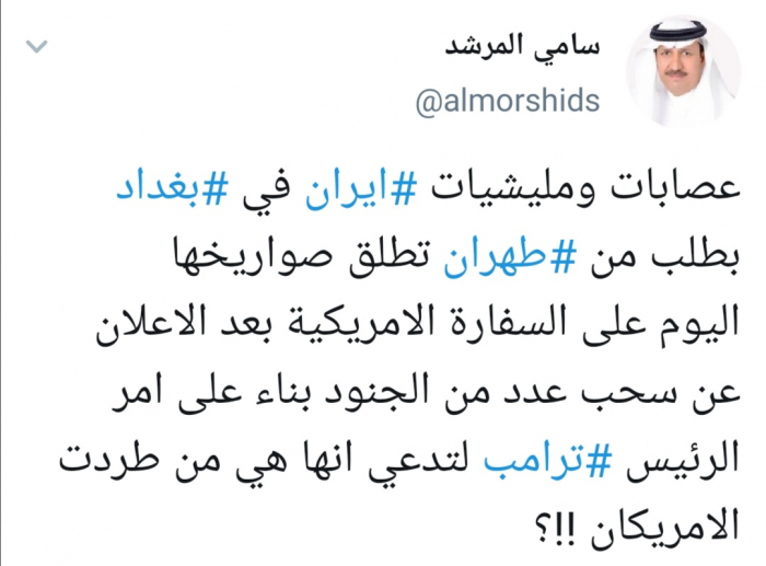 وقال المرشد في تغريدة له عبر حسابه بتويتر ورصدها "المشهد العربي": "عصابات ومليشيات إيران في بغداد بطلب من طهران تطلق صواريخها اليوم على السفارة الأمريكية بعد الإعلان عن سحب عدد من الجنود بناء على أمر الرئيس ترامب لتدعي أنها هي من طردت الأمريكان".