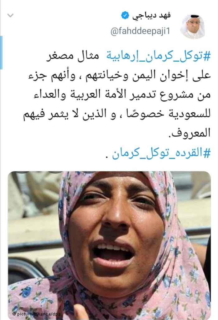 وقال ديباجي عبر حسابه في تويتر ورصدها "المشهد العربي": "توكل كرمان إرهابية مثال مصغر على إخوان اليمن وخيانتهم ، وأنهم جزء من مشروع تدمير الأمة العربية والعداء للسعودية خصوصًا، والذين لا يثمر فيهم المعروف".