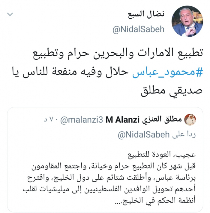 وقال السبع في تغريدة له عبر حسابه بتويتر ورصدها "المشهد العربي": "تطبيع الإمارات والبحرين حرام وتطبيع محمود عباس حلال وفيه منفعة للناس".