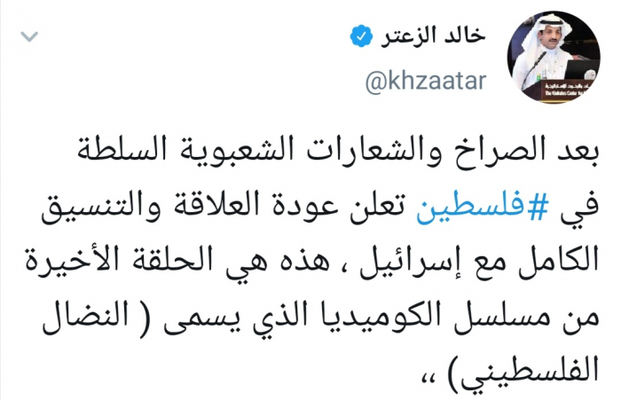 وقال الزعتر عبر تغريدة له على "تويتر" رصدها "المشهد العربي" :"بعد الصراخ والشعارات الشعبوية السلطة في فلسطين تعلن عودة العلاقة والتنسيق الكامل مع إسرائيل".