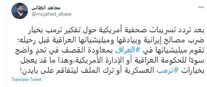 وكتب في تغريدة عبر "تويتر" رصدها "المشهد العربي": "بعد تردد تسريبات صحفية أمريكية حول تفكير ترمب بخيار ضرب مصالح إيرانية وبيادقها وميليشياتها العراقية قبل رحيله؛ تقوم مليشياتها في العراق بمعاودة القصف في تحدٍ واضح سوءًا للحكومة العراقية أو الإدارة الأمريكية، وهذا ما قد يعجل بخيارات ترامب العسكرية أو ترك الملف ليتفاقم على بايدن".