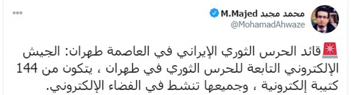 وقال في تغريدة عبر "تويتر" رصدها "المشهد العربي": "قائد الحرس الثوري الإيراني في العاصمة طهران: الجيش الإلكتروني التابعة للحرس الثوري في طهران، يتكون من 144 كتيبة إلكترونية، وجميعها تنشط في الفضاء الإلكتروني".