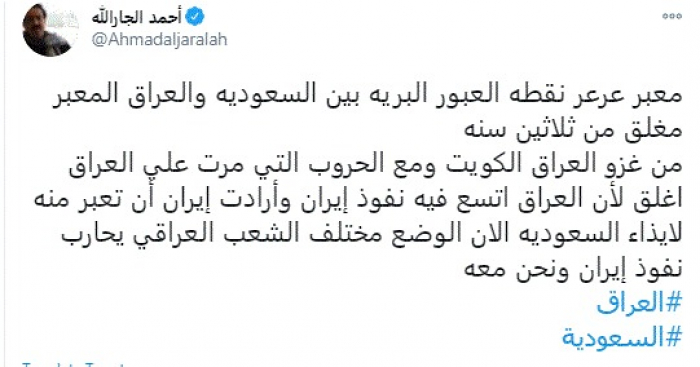 وقال في تغريدة عبر "تويتر" رصدها "المشهد العربي": "معبر عرعر نقطة العبور البرية بين السعودية والعراق المعبر مغلق من ثلاثين سنة من غزو العراق الكويت ومع الحروب التي مرت علي العراق أغلق لأن العراق اتسع فيه نفوذ إيران وأرادت إيران أن تعبر منه لإيذاء السعودية الآن الوضع مختلف الشعب العراقي يحارب نفوذ إيران ونحن معه".