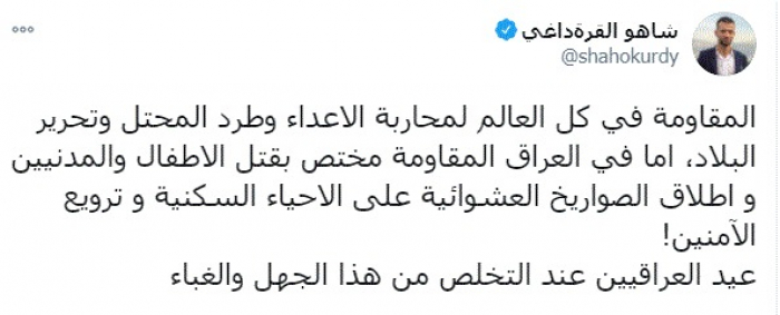 وقال في تغريدة عبر "تويتر" رصدها "المشهد العربي": "المقاومة في كل العالم لمحاربة الأعداء وطرد المحتل وتحرير البلاد، أما في العراق المقاومة مختص بقتل الأطفال والمدنيين وإطلاق الصواريخ العشوائية على الأحياء السكنية وترويع الآمنين! عيد العراقيين عند التخلص من هذا الجهل والغباء".
