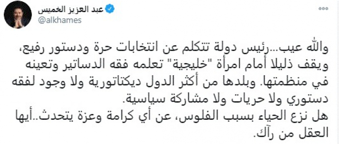 وقال في تغريدة عبر "تويتر" رصدها "المشهد العربي": "والله عيب...رئيس دولة تتكلم عن انتخابات حرة ودستور رفيع، ويقف ذليلا أمام امرأة خليجية تعلمه فقه الدساتير وتعينه في منظمتها. وبلدها من أكثر الدول ديكتاتورية ولا وجود لفقه دستوري ولا حريات ولا مشاركة سياسية".