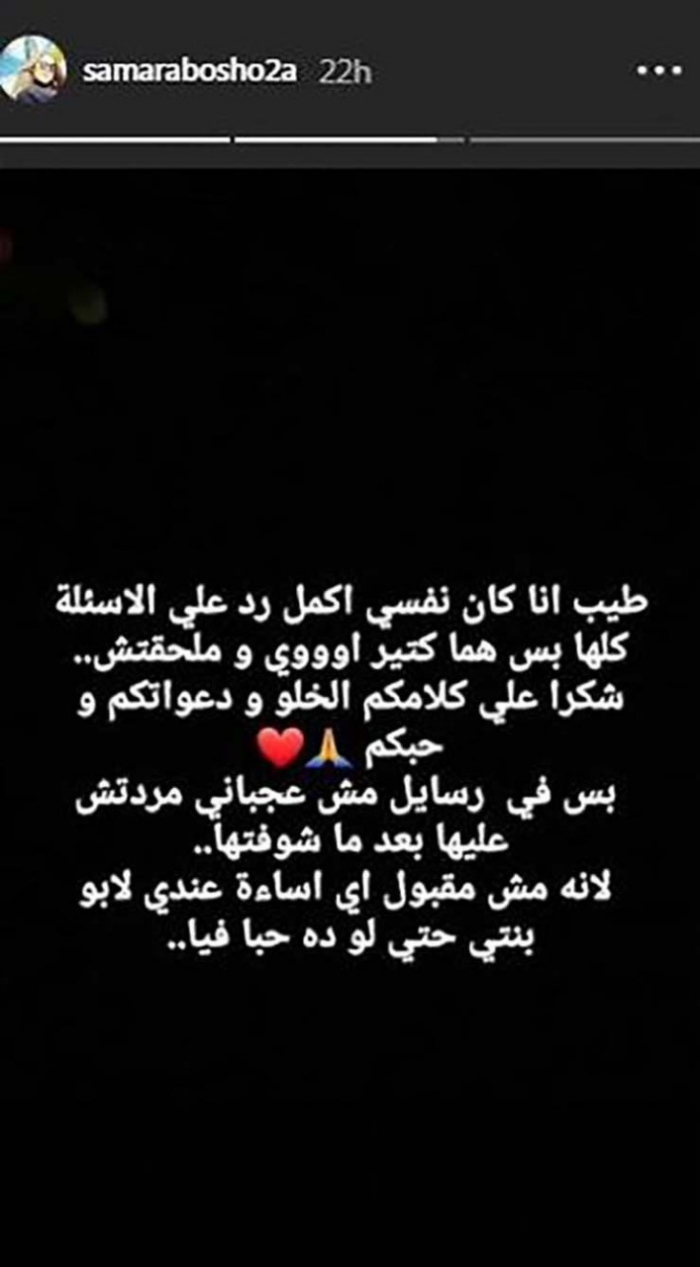 ويبدو أن سمر تلقت العديد من الرسائل التي تتضامن مع موقفها وصلت لحد الإساءة لزوجها المطرب الشهير، وهو ما رفضته ووجهت رسالة لمتابعيها قائلة: "كان نفسي أرد على كل أسئلتكم بس هي كتير أوي وملحقتش، شكرا على كل الكلام الحلو والدعوات والحب، بس فيه رسايل مش عجباني مردتش عليها بعد ما شوفتها لانه مش مقبول ابدًا أي إساءة عندي لأبو بنتي حتى لو ده حب فيا".