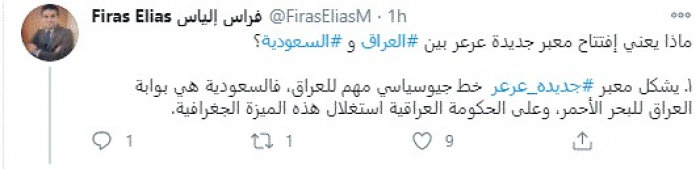 وقال في سلسلة تغريدات عبر "تويتر" رصدها "المشهد العربي": "ماذا يعني افتتاح معبر جديدة عرعر بين العراق والسعودية؟ يشكل معبر جديده عرعر خط جيوسياسي مهم للعراق، فالسعودية هي بوابة العراق للبحر الأحمر، وعلى الحكومة العراقية استغلال هذه الميزة الجغرافية".