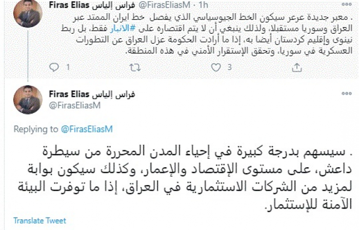 وأضاف: "معبر جديدة عرعر سيكون الخط الجيوسياسي الذي يفصل خط إيران الممتد عبر العراق وسوريا مستقبلا، ولذلك ينبغي أن لا يتم اقتصاره على الأنبار فقط، بل ربط نينوى وإقليم كردستان أيضا به، إذا ما أرادت الحكومة عزل العراق عن التطورات العسكرية في سوريا، وتحقق الإستقرار الأمني في هذه المنطقة".