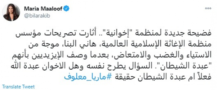 وقال في تغريدة عبر "تويتر" رصدها "المشهد العربي": "فضيحة جديدة لمنظمة إخوانية.. أثارت تصريحات مؤسس منظمة الإغاثة الإسلامية العالمية، هاني البنا، موجة من الاستياء والغضب والامتعاض، بعدما وصف الإيزيديين بأنهم عبدة الشيطان. السؤال يطرح نفسه وهل الاخوان عبدة الله فعلاً ام عبدة الشيطان حقيقة".