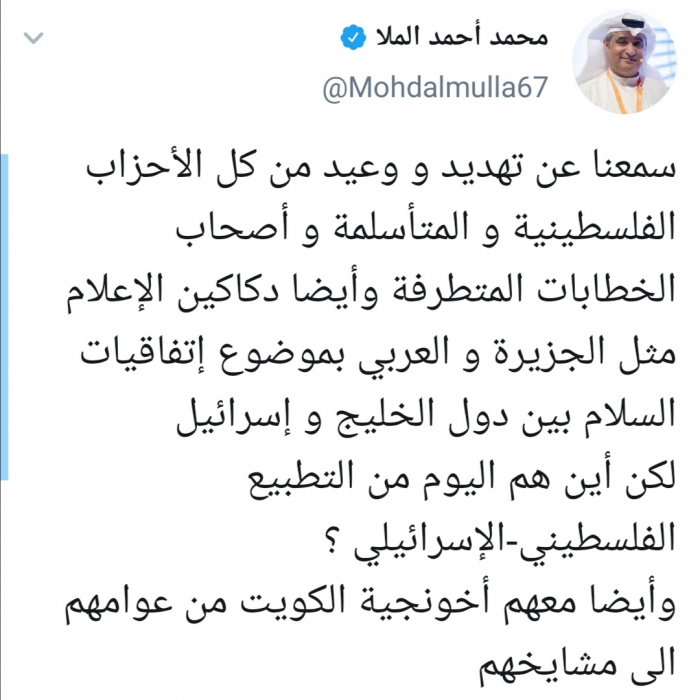 وكتب الملا في تغريدة له عبر حسابه بتويتر ورصدها "المشهد العربي": "سمعنا عن تهديد ووعيد من كل الأحزاب الفلسطينية والمتأسلمة وأصحاب الخطابات المتطرفة وأيضا دكاكين الإعلام مثل الجزيرة و العربي بموضوع اتفاقيات السلام بين دول الخليج وإسرائيل".