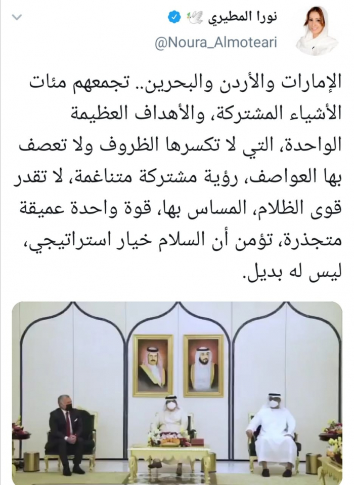 وقالت المطيري في تغريدة لها عبر حسابها بتويتر ورصدها "المشهد العربي": "الإمارات والأردن والبحرين.. تجمعهم مئات الأشياء المشتركة، والأهداف العظيمة الواحدة، التي لا تكسرها الظروف ولا تعصف بها العواصف، رؤية مشتركة متناغمة، لا تقدر قوى الظلام، المساس بها".