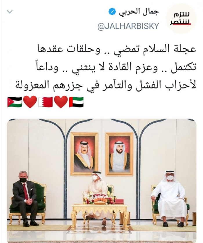 وقال الحربي في تغريدة له عبر حسابه بتويتر ورصدها "المشهد العربي" :"عجلة السلام تمضي .. وحلقات عقدها تكتمل .. وعزم القادة لا ينثني .. وداعاً لأحزاب الفشل والتآمر في جزرهم المعزولة".