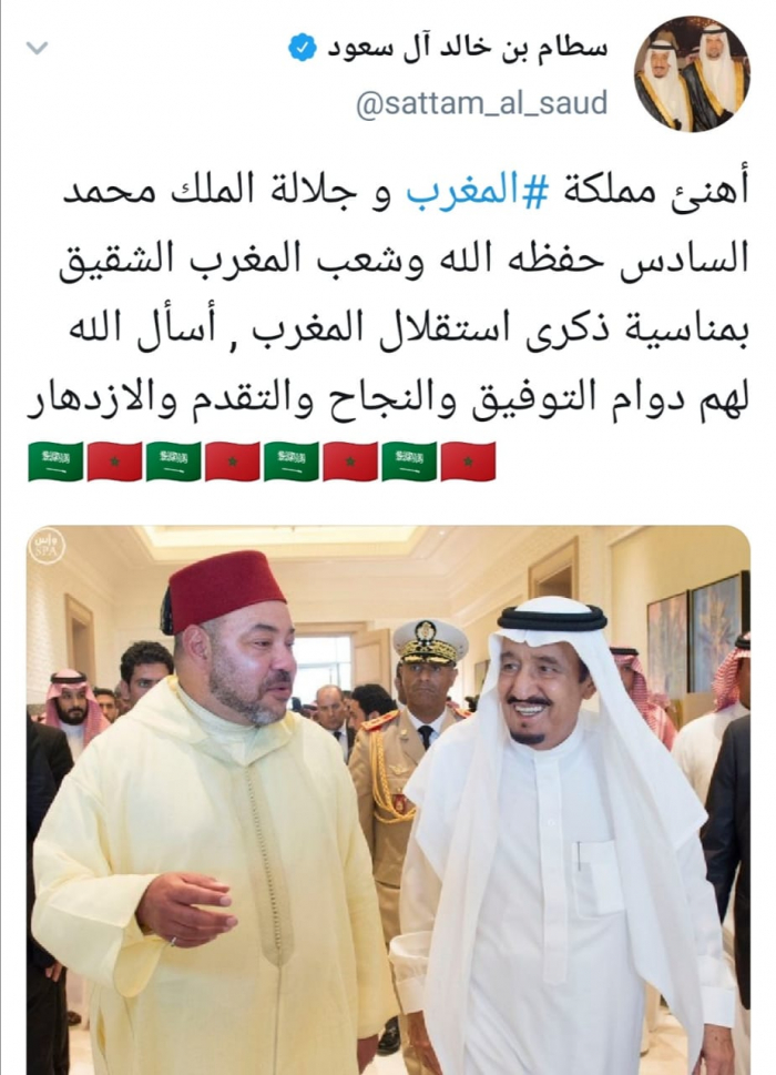 وقال آل سعود في تغريدة له عبر حسابه بتويتر ورصدها "المشهد العربي": "أهنئ مملكة المغرب و جلالة الملك محمد السادس حفظه الله وشعب المغرب الشقيق بمناسية ذكرى استقلال المغرب".