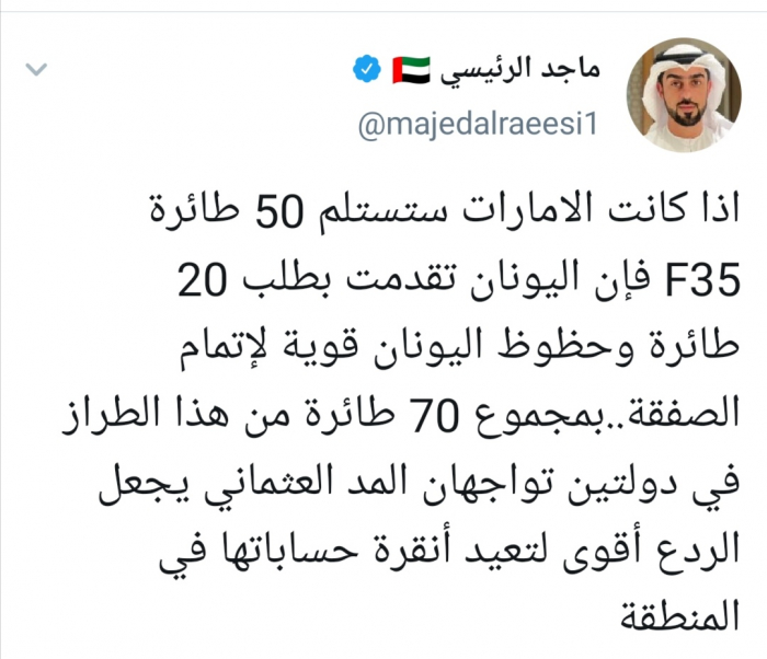 أكد الكاتب الإماراتي ماجد الرئيسي، أن الإمارات واليونان يمتلكان 70 طائرة لوقف المد العثماني.