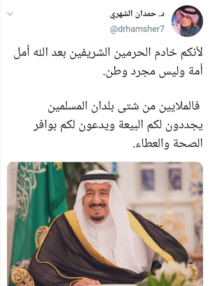 وقال الشهري في تغريدة له عبر حسابه بتويتر ورصدها المشهد العربي: "لأنكم خادم الحرمين الشريفين بعد الله أمل أمة وليس مجرد وطن، فالملايين من شتى بلدان المسلمين يجددون لكم البيعة ويدعون لكم بوافر الصحة والعطاء".