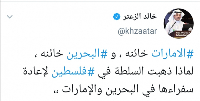 وقال الزعتر عبر تغريدة له على "تويتر" رصدها "المشهد العربي" :"الإمارات خائنة، والبحرين خائنة، لماذا ذهبت السلطة في فلسطين لإعادة سفراءها في البحرين والإمارات".