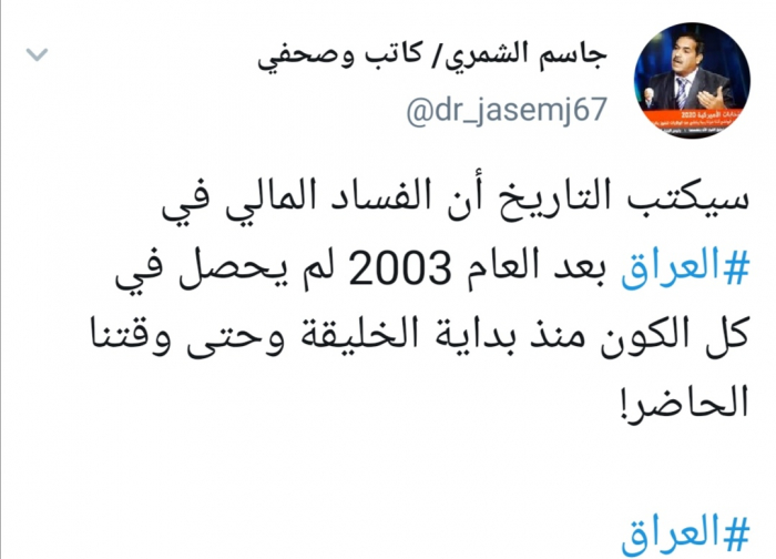 وقال الشمري في تغريدة له عبر حسابه بتويتر ورصدها "المشهد العربي": "سيكتب التاريخ أن الفساد المالي في العراق بعد العام 2003 لم يحصل في كل الكون منذ بداية الخليقة وحتى وقتنا الحاضر".