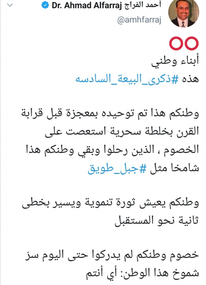 وقال الفراج عبر تغريدة له على حسابه بتويتر ورصدها "المشهد العربي" : "أبناء وطني هذه ذكرى البيعة السادسة، وطنكم هذا تم توحيده بمعجزة قبل قرابة القرن بخلطة سحرية استعصت على الخصوم، الذين رحلوا وبقي وطنكم هذا شامخا مثل جبل طويق".