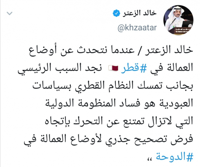 وقال الزعتر عبر تغريدة له على "تويتر" رصدها "المشهد العربي" :"عندما نتحدث عن أوضاع العمالة في قطر نجد السبب الرئيسي بجانب تمسك النظام القطري بسياسات العبودية هو فساد المنظومة الدولية التي لاتزال تمتنع عن التحرك بإتجاه فرض تصحيح جذري لأوضاع العمالة في الدوحة".