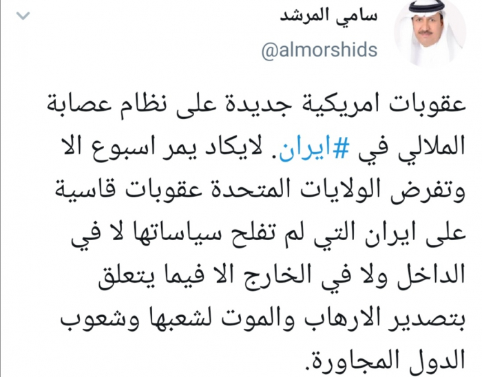 وقال المرشد في تغريدة له عبر حسابه بتويتر ورصدها "المشهد العربي": "عقوبات أمريكية جديدة على نظام عصابة الملالي في إيران لايكاد يمر أسبوع إلا وتفرض الولايات المتحدة عقوبات قاسية على إيران".