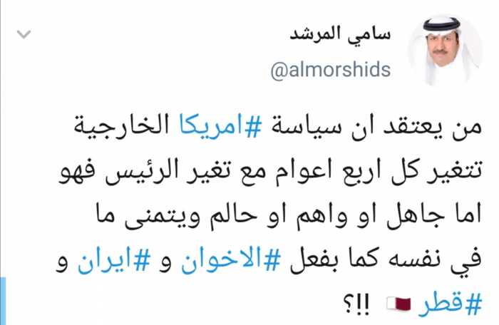 وقال المرشد في تغريدة له عبر حسابه بتويتر ورصدها "المشهد العربي": "من يعتقد أن سياسة أمريكا الخارجية تتغير كل أربع أعوام مع تغير الرئيس فهو أما جاهل أو واهم أو حالم ويتمنى ما في نفسه كما بفعل الإخوان وإيران وقطر".