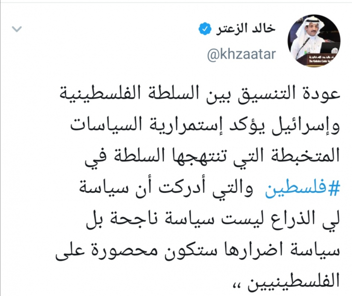 وقال الزعتر عبر تغريدة له على "تويتر" رصدها "المشهد العربي" :"عودة التنسيق بين السلطة الفلسطينية وإسرائيل يؤكد استمرارية السياسات المتخبطة التي تنتهجها السلطة في فلسطين".