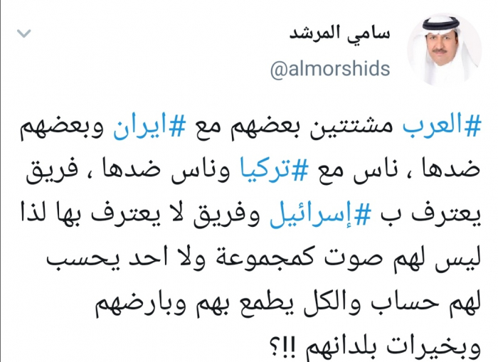 وقال المرشد في تغريدة له عبر حسابه بتويتر ورصدها "المشهد العربي": "العرب مشتتين بعضهم مع إيران وبعضهم ضدها، ناس مع تركيا وناس ضدها، فريق يعترف بإسرائيل وفريق لا يعترف بها لذا ليس لهم صوت كمجموعة ولا أحد يحسب لهم حساب والكل يطمع بهم وبأرضهم وبخيرات بلدانهم".