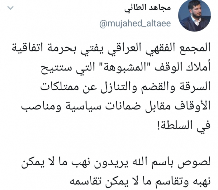 وقال الطائي في تغريدة له عبر حسابه بتويتر ورصدها "المشهد العربي": "المجمع الفقهي العراقي يفتي بحرمة اتفاقية أملاك الوقف "المشبوهة" التي ستتيح السرقة والقضم والتنازل عن ممتلكات الأوقاف مقابل ضمانات سياسية ومناصب في السلطة".