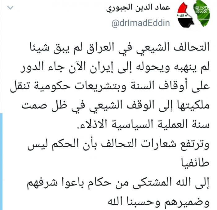 وقال الجبوري في تغريدة له عبر حسابه بتويتر ورصدها المشهد العربي: "التحالف الشيعي في العراق لم يبق شيئا لم ينهبه ويحوله إلى إيران الآن جاء الدور على أوقاف السنة وبتشريعات حكومية تنقل ملكيتها إلى الوقف الشيعي في ظل صمت سنة العملية السياسية الاذلاء".