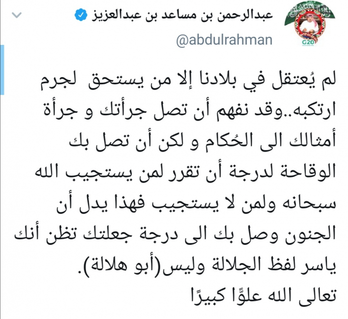 وقال بن مساعد في تغريدة له عبر حسابه بتويتر ورصدها المشهد العربي "لم يُعتقل في بلادنا إلا من يستحق لجرم ارتكبه.. وقد نفهم أن تصل جرأتك وجرأة أمثالك إلى الحُكام ولكن أن تصل بك الوقاحة لدرجة أن تقرر لمن يستجيب الله سبحانه ولمن لا يستجيب فهذا يدل أن الجنون وصل بك إلى درجة جعلتك تظن أنك ياسر لفظ الجلالة وليس(أبو هلالة).