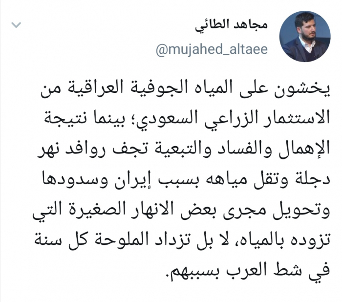 وقال الطائي في تغريدة له عبر حسابه بتويتر ورصدها "المشهد العربي": "يخشون على المياه الجوفية العراقية من الاستثمار الزراعي السعودي؛ بينما نتيجة الإهمال والفساد والتبعية تجف روافد نهر دجلة وتقل مياهه بسبب إيران وسدودها وتحويل مجرى بعض الأنهار الصغيرة التي تزوده بالمياه، لا بل تزداد الملوحة كل سنة في شط العرب بسببهم".