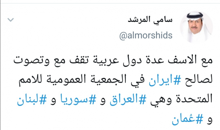 وقال المرشد في تغريدة له عبر حسابه بتويتر ورصدها "المشهد العربي": "مع الأسف عدة دول عربية تقف مع وتصوت لصالح إيران في الجمعية العمومية للأمم المتحدة وهي العراق وسوريا ولبنان وعُمان".