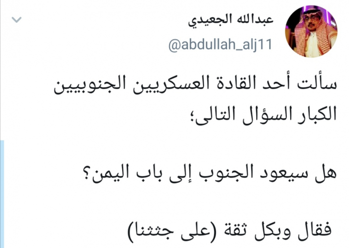 وقال الجعيدي عبر حسابه في تويتر ورصدها "المشهد العربي": "سألت أحد القادة العسكريين الجنوبيين الكبار السؤال التالي، هل سيعود الجنوب إلى باب اليمن"؟