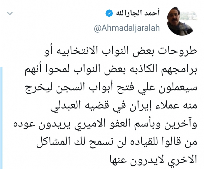 وقال الجار الله عبر تغريدة له على " تويتر" رصدها " المشهد العربي :" طروحات بعض النواب الانتخابية أو برامجهم الكاذبة بعض النواب لمحوا أنهم سيعملون علي فتح أبواب السجن ليخرج منه عملاء إيران في قضية العبدلي".