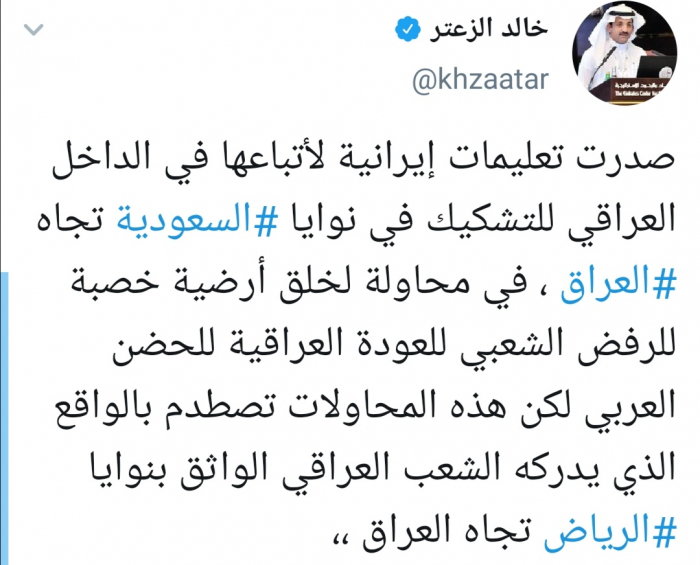 وقال الزعتر عبر تغريدة له على "تويتر" رصدها "المشهد العربي" :"صدرت تعليمات إيرانية لأتباعها في الداخل العراقي للتشكيك في نوايا السعودية تجاه العراق، في محاولة لخلق أرضية خصبة للرفض الشعبي للعودة العراقية للحضن العربي".