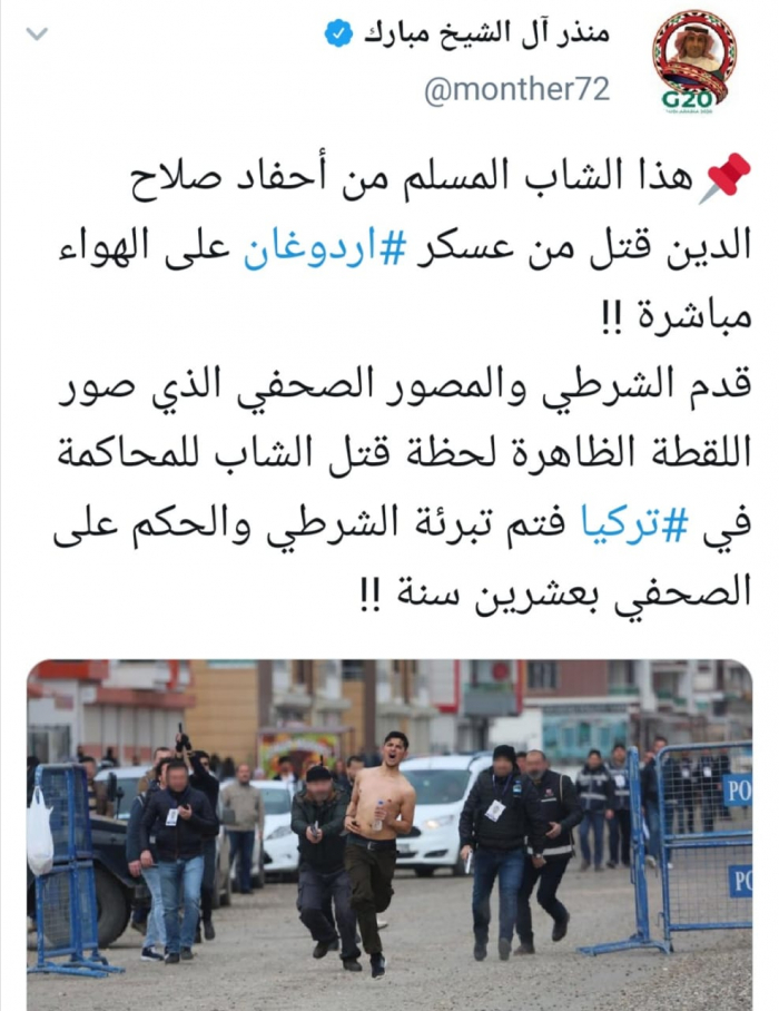 وقال آل شيخ المبارك عبر تغريدة له على "تويتر" رصدها " المشهد العربي" : "هذا الشاب المسلم من أحفاد صلاح الدين قتل من عسكر أردوغان على الهواء مباشرة".