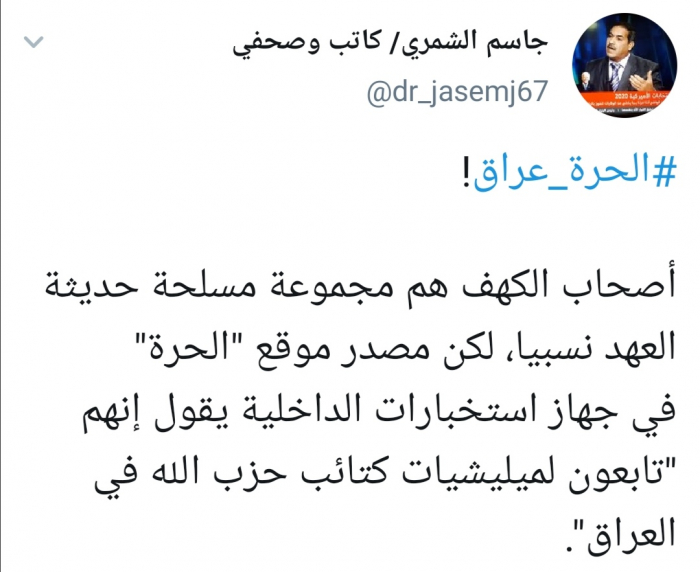 وقال الشمري في تغريدة له عبر حسابه بتويتر ورصدها "المشهد العربي": "أصحاب الكهف هم مجموعة مسلحة حديثة العهد نسبيا، لكن مصدر موقع "الحرة" في جهاز استخبارات الداخلية يقول إنهم "تابعون لميليشيات كتائب حزب الله في العراق".