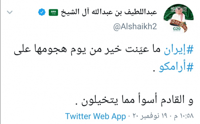 وقال آل الشيخ في تغريدة له عبر حسابه بتويتر ورصدها "المشهد العربي": "إيران ما عيّنت خير من يوم هجومها على أرامكو".