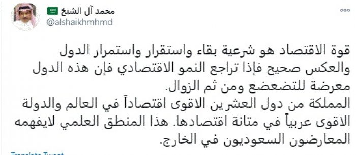 وكتب في تغريدة عبر "تويتر" رصدها "المشهد العربي": "قوة الاقتصاد هو شرعية بقاء واستقرار واستمرار الدول والعكس صحيح فإذا تراجع النمو الاقتصادي فإن هذه الدول معرضة للتضعضع ومن ثم الزوال".