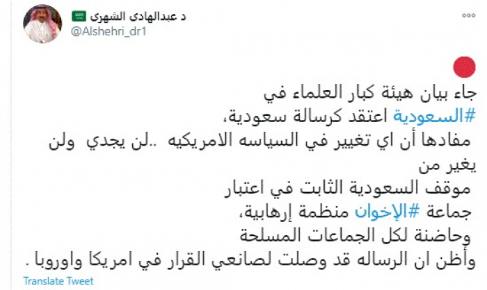 وكتب في تغريدة عبر "تويتر" رصدها "المشهد العربي": "جاء بيان هيئة كبار العلماء في السعودية اعتقد كرسالة سعودية، مفادها أن أي تغيير في السياسة الأمريكية.. لن يجدي ولن يغير من موقف السعودية الثابت في اعتبار جماعة الإخوان منظمة إرهابية وحاضنة لكل الجماعات المسلحة وأظن أن الرسالة قد وصلت لصانعي القرار في أمريكا وأوروبا".