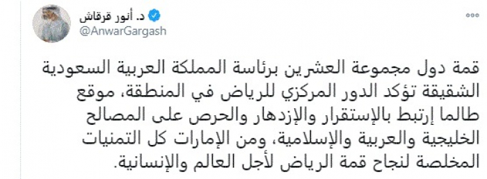 وكتب في تغريدة عبر "تويتر" رصدها "المشهد العربي": "قمة دول مجموعة العشرين برئاسة المملكة العربية السعودية الشقيقة تؤكد الدور المركزي للرياض في المنطقة، موقع طالما إرتبط بالإستقرار والإزدهار والحرص على المصالح الخليجية والعربية والإسلامية، ومن الإمارات كل التمنيات المخلصة لنجاح قمة الرياض لأجل العالم والإنسانية".