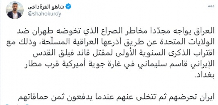 حذر الكاتب الصحفي العراقي شاهو القرةداغي، اليوم، من مُخططات إيران وأذرعها في العراق مع اقتراب الذكرى السنوية الأولى لمقتل قاسم سليماني.
