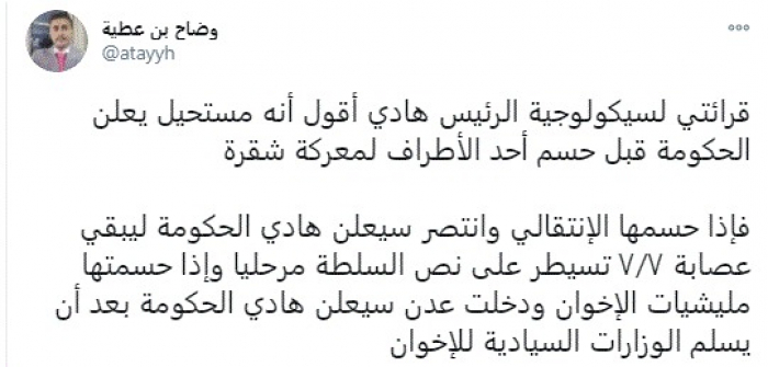 وكتب في تغريدة عبر "تويتر" رصدها "المشهد العربي": "قرائتي لسيكولوجية الرئيس هادي أقول أنه مستحيل يعلن الحكومة قبل حسم أحد الأطراف لمعركة شقرة".