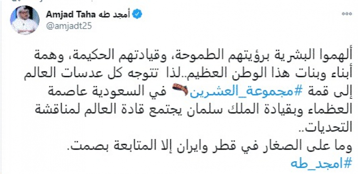 وقال في تغريدة عبر "تويتر" رصدها "المشهد العربي": "ألهموا البشرية برؤيتهم الطموحة، وقيادتهم الحكيمة، وهمة أبناء وبنات هذا الوطن العظيم.. لذا تتوجه كل عدسات العالم إلى قمة مجموعة العشرين في السعودية عاصمة العظماء وبقيادة الملك سلمان يجتمع قادة العالم لمناقشة التحديات.. وما على الصغار في قطر وايران إلا المتابعة بصمت".