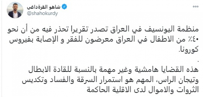 وقال في تغريدة عبر "تويتر" رصدها "المشهد العربي": "منظمة اليونسيف في العراق تصدر تقريرا تحذر فيه من أن نحو ٤٠٪ من الاطفال في العراق معرضون للفقر و الإصابة بفيروس كورونا".