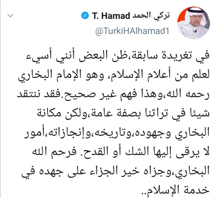 وقال الحمد في تغريدة له عبر حسابه بتويتر ورصدها "المشهد العربي": "في تغريدة سابقة،ظن البعض أنني أسيء لعلم من أعلام الإسلام، وهو الإمام البخاري رحمه الله".