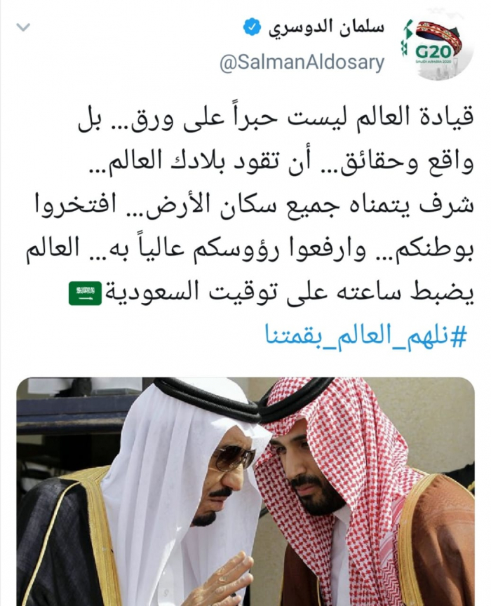 وكتب الدوسري عبر تغريدة له على "تويتر" رصدها " المشهد العربي": "قيادة العالم ليست حبراً على ورق بل واقع وحقائق أن تقود بلادك العالم شرف يتمناه جميع سكان الأرض".